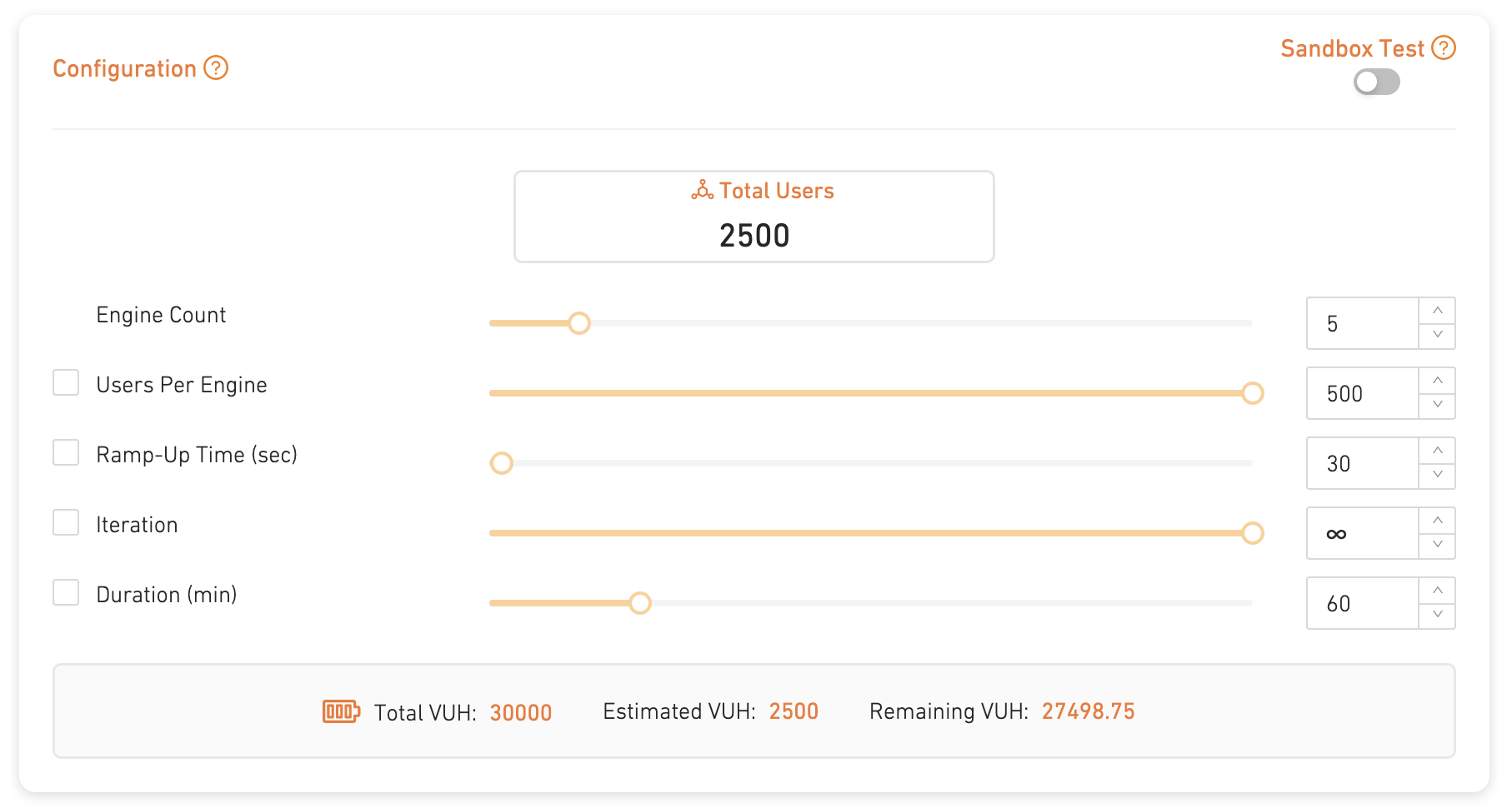 You can configure the virtual user amount, their ramp-up period, and test duration (some parameters may vary between the technologies)