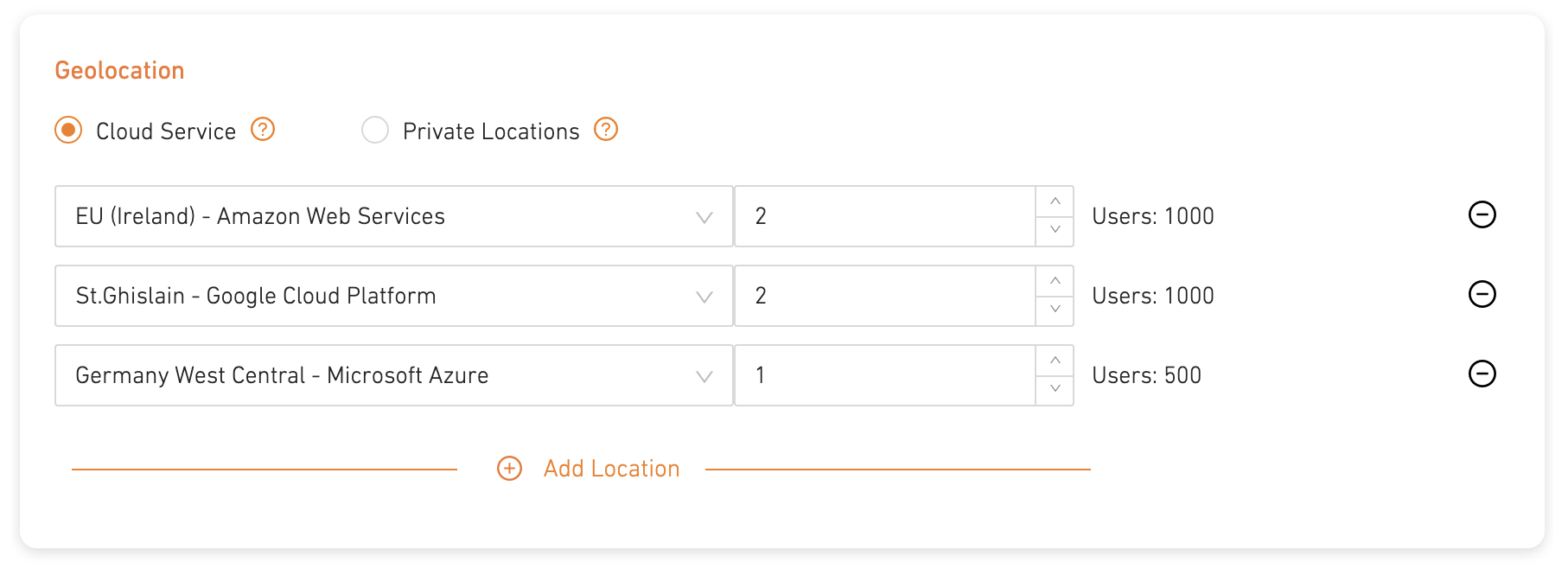 You can choose to distribute your load generation to multiple locations with Cloud Service or use your personal servers with Private Locations.