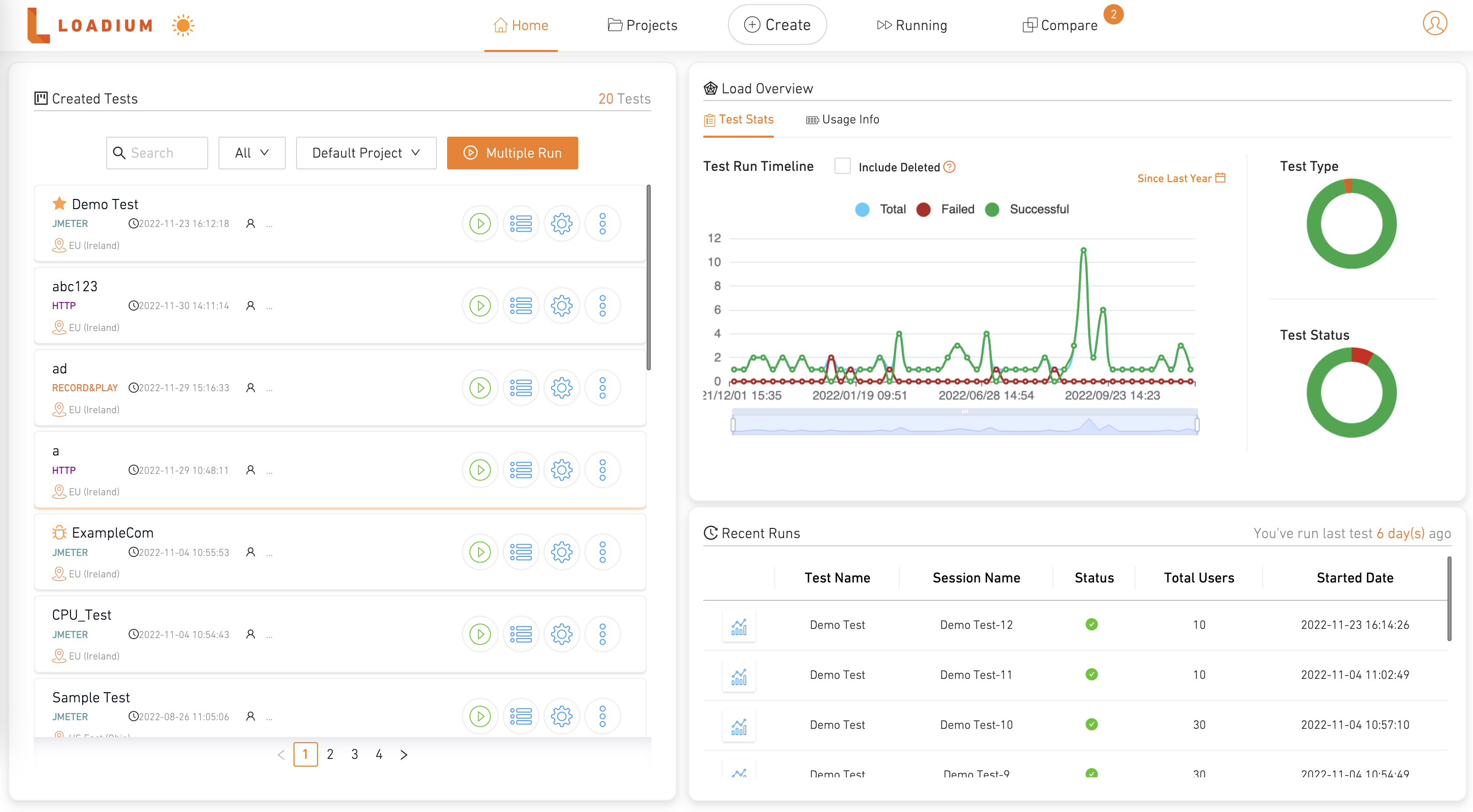 When you finish creating a test, the information you have put; uploaded files, load configurations, geolocations, KPI, etc. will be saved and you can access it from the Home Page. You can run your created tests from the Home Page.