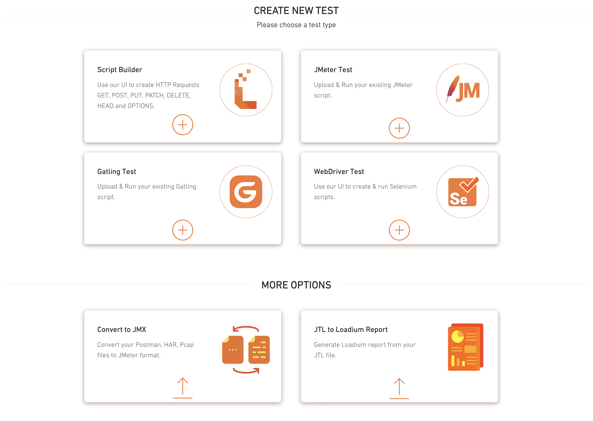 Allows you to start creating a test with Script Builder, JMeter file, Gatling file, and Selenium WebDriver editor. Also presents other options Convert to JMX and JTL to Loadium Report.