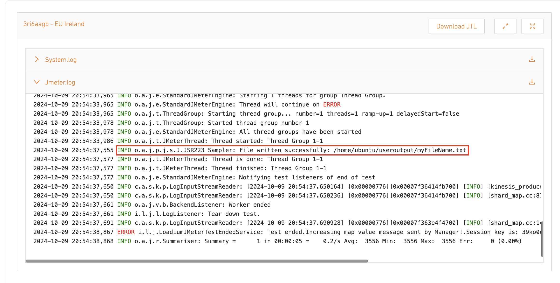 Run the test for which you want to get the file outputs and wait for the test to finish. To verify that your file has been successfully written, check the **JMeter.log** window in the **Logs** tab.